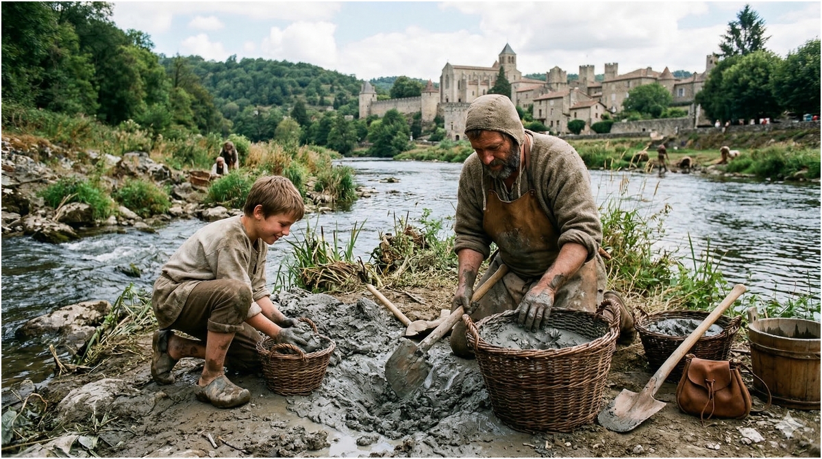 Gautier s'installe devant son tour à bâton (un plateau de bois lourd qu'il lance à la main ou avec un grand bâton). Ses doigts agiles font monter la terre. Aujourd'hui, il produit des "oules" (marmites globulaires) et des pichets pour les tavernes de la ville.